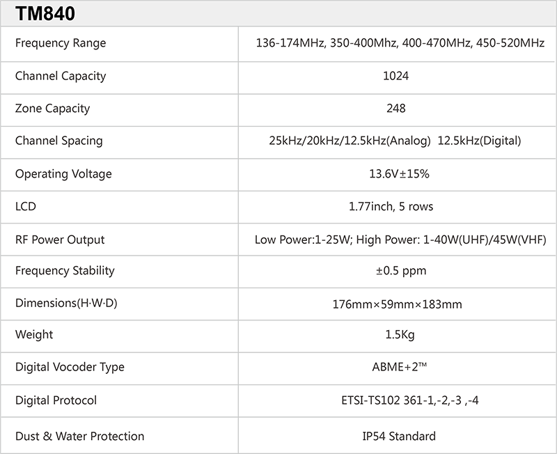 The Intelligent TM840 supports various voice call types, including Private Call, Group Call, All Call and Emergency Call, as well as data services, e.g. Text Message and Data Transfer.