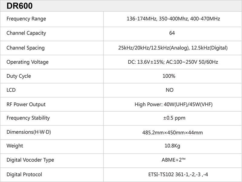 DR600 can be configured to analog, digital or mixed mode. In mixed mode, the repeater can dynamically switch between modes regarding on received signal type.