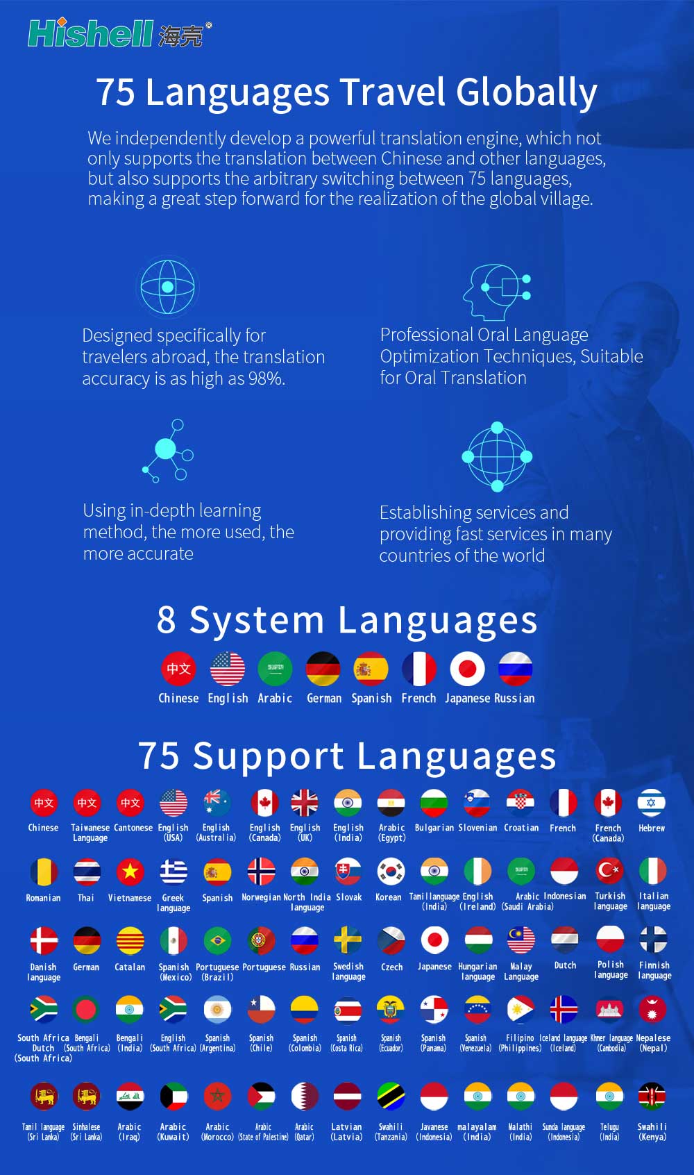 4.translate 75 language WIFI online and 5 language(Chinese, English, Japanese, Korean and French) offline by cost free for you.